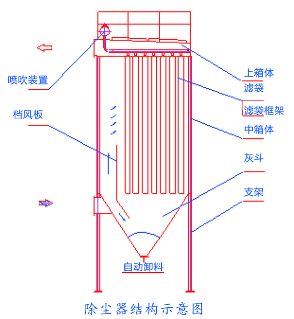 含氣體由灰斗上部進風(fēng)口進入后,在擋風(fēng)板的作用下,氣流向上流動,流速降低,部分大顆粒粉塵由于慣性力的作用被分離出來落入灰斗。含塵氣體進入中箱體經(jīng)濾袋的過濾口進入上箱體,由出風(fēng)口排出。